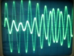 Bei den zwei Stimmgabeln hörte man einen wabernden Ton, der periodisch lauter und leiser wurde. (Waa-Waa-Waa) Wenn der Reiter unten befestigt ist, wechselte Laut und Leise sich nur langsam ab. Ist der Reiter am oberen Ende des Zinkens, so wechselt Laut und Leise sehr schnell und der Ton hört sich sehr schief an. Auf dem Monitor wird eine Schwingung mit sich regelmäßig ändernden Amplituden angezeigt.