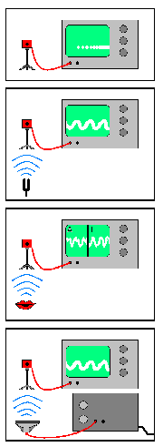 Die Stimmgabeln schwingen und versetzen die Luft in Schwingungen. (Der Kasten an den Stimmgabeln hilft durch die große Oberfläche die Energie an die Luft abzugeben.) Beim Singen oder Sprechen regen wir die in unserer Lunge und im Mundraum vorhandene Luft zu einer selbsterregten Schwingung an. Das heißt, die Luft wird periodisch zusammengedrückt und auseinandergezogen. Diese Verschiebungen der Luftmoleküle führen zu Druckveränderungen und setzen sich durch die Luft bis an unser Trommelfell oder an das Mikrophon fort. [1] Das Trommelfell wird durch die Schwingung der Luft [2] ebenfalls in Schwingungen versetzt. Das Mikrophon übersetzt die Lageveränderungen der Luftmoleküle in Spannungsveränderungen, welche am Oszilloskop angezeigt werden. Die x-Achse der Darstellung ist die Zeit, die y-Achse die Spannung, also die Auslenkung der Luftmoleküle.