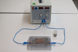 - Schließe mit 2 Kabeln die Spule an das Netzgerät an.