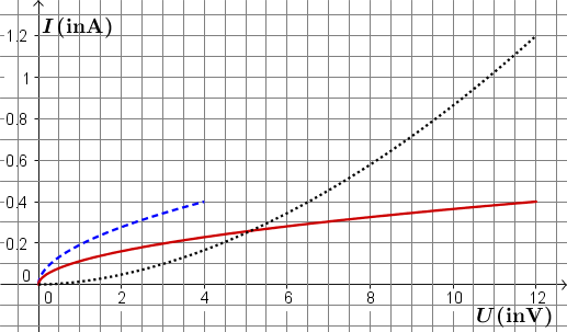 - Die gepunktete Linie hat eine andere Krümmung als die Kennlinien der Lämpchen. Das liegt daran, dass der Glühdraht der Lämpchen ein Kaltleiter ist und Graphit ein Heissleiter. Der Widerstand der Lämpchen nimmt mit steigender Temperatur zu, der Widerstand der Graphitmine nimmt mit steigender Temperatur ab.