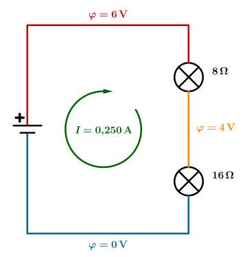 - b) Das Potential steigt an der Batterie an und fällt an den Lämpchen ab. (Noch kennt man keine Zahlenwerte!)