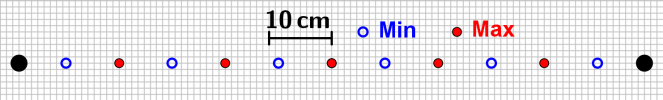 b) Zwischen den Lautsprechern befindet sich eine stehende Welle. (Vgl. Lautsprecherversuch) In der Mitte zwischen den Lautsprechern ist ein Bauch. Dort ist ein lauter Ton zuhören. Die Abstände zwischen den Bäuchen beträgt eine halbe Wellenlänge, das sind 20cm. Zwischen zwei Bäuchen liegen Knoten. Dort hört man den Ton (fast) nicht.