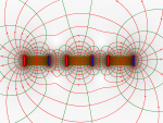 • Zeichnen Sie einige Feldlinien mit Pfeilen (rot) und Feldflächen (grün) ein.