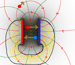 • Die positiv geladenen Probekörper (rot) werden in Richtung der Feldlinien gezogen, die negativen (blau) in die entgegengesetzte Richtung.