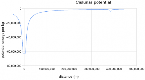 Um über den "Potentialberg" zu kommen, muß man die maximale Potentialdifferenz von [math]\Delta \varphi \approx 60\,\rm \frac{MJ}{kg}[/math] überwinden. Danach geht es dann wieder ein wenig "bergab".