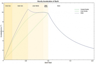 Realistischerer Verlauf der inneren Feldstärke nach genauerern Modellen. (Wikipedia: Preliminary Reference Earth Model)