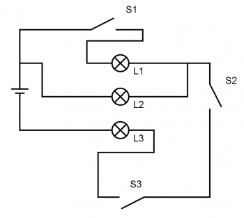 - a) ist von den Lampen her gleich aufgebaut wie b) und c), der einzige Unterschied ist die Position des Schalters: Bei a) werden alle drei Lampen an- und ausgeschaltet, bei b) und c) nur zwei Lampen.