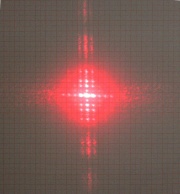 - Ein roter Laserpointer, mit einer Wellenlänge von 630nm wird auf einen Schal gerichtet. Drei Meter hinter dem Schal kann man folgende Beobachtung auf mm-Papier machen.