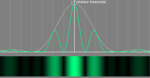 An der Stelle des 1. Minimums des Einzelspaltes befindet sich hier das 4. Maximum des Doppelspaltes.