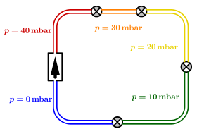 Wie wir in einem Experiment herausgefunden haben, erzeugt die Pumpe am Ausgang einen hohen Druck und am Eingang einen niedrigen Druck. Wenn das Wasser vom Ausgang zum Eingang zurückfließt nimmt der Druck dabei ab.