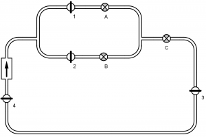 Zeichne zu den gegebenen Schaltplänen den jeweils entsprechenden Wasserstromkreis, bzw. den entsprechenden elektrischen Stromkreis. (Das ist auch mit Hilfe von Geogebra möglich.)