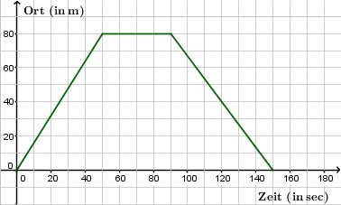 - Sie läuft mit einer konstanten Geschwindigkeit 80m in 45sec. Dann bleibt sie für 40sec stehen, kehrt um und läuft die 80m in einer Minute wieder zurück.