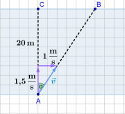 - [math]v_y = \frac{\Delta s}{\Delta t} \quad \Longleftrightarrow \quad 1{,}5\,\rm \frac{m}{s} = \frac{20\,\rm m}{\Delta t}[/math]