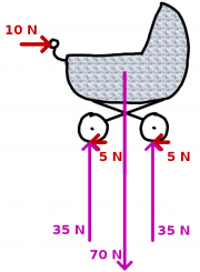 Zeichne in das Schnittbild des Kinderwagens alle wirkenden Kräfte ein. ([math]1\,\rm cm \hat = 10\,\rm N[/math] )