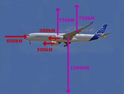 Damit ein Airbus 350 mit konstant 900km/h fliegen kann wird er von zwei Triebwerken mit zusammen ca. 600kN angeschoben. Er hat eine Masse von ca. 150t.