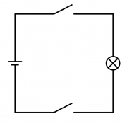 - Der Stromkreis wird von zwei Schaltern unterbrochen. Nur wenn der eine UND der andere Schalter geschlossen ist, leuchtet das Lämpchen.