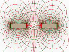 14) Zeichne einige Feldlinien in rot (mit Pfeilen) und Feldflächen (in grün) des Magnetfeldes möglichst genau ein.