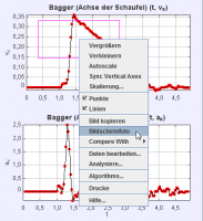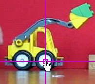 Die automatische Analyse funktioniert nur, wenn das Objekt oder eine spezielle Markierung sich ganz klar vom Hintergrund absetzt. Im Fall des Baggers wurde bei der automatischen Positionserfassung des Vorderrades auf einmal auf das nachfolgende Hinterrad gewechselt. Deshalb soll jetzt die Achse der Schaufel verfolgt werden. Man hätte aber auch den grünen Baustein in der Ladeschaufel nehmen können.
