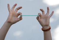 Man drückt den Grashüpfer nach unten und läßt ihn los.