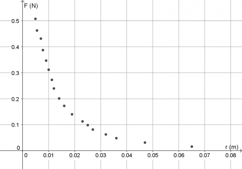 r'(cm) x (cm) F (N) 0.49 51.8 0.5076 0.55 47.2 0.4626 0.70 44.0 0.4312 0.78 39.5 0.3871 0.90 35.4 0.3469 1.00 31.8 0.3116 1.12 27.8 0.2724 1.2 24.4 0.2391 1.4 20.5 0.2009 1.6 17.6 0.1725 1.9 14.3 0.1401 2.3 11.5 0.1127 2.5 10.0 0.0980 2.7 8.3 0.0813 3.2 6.4 0.0627 3.6 4.9 0.0480 4.7 3.2 0.0314 6.5 1.6 0.0157