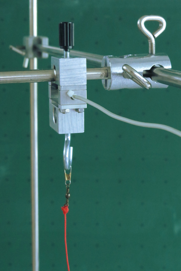 Datei:Kreisbewegung Zentripetalkraft Versuchsaufbau Kraftsensor.jpg