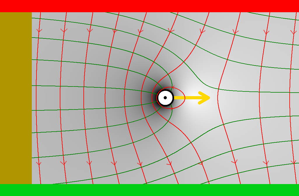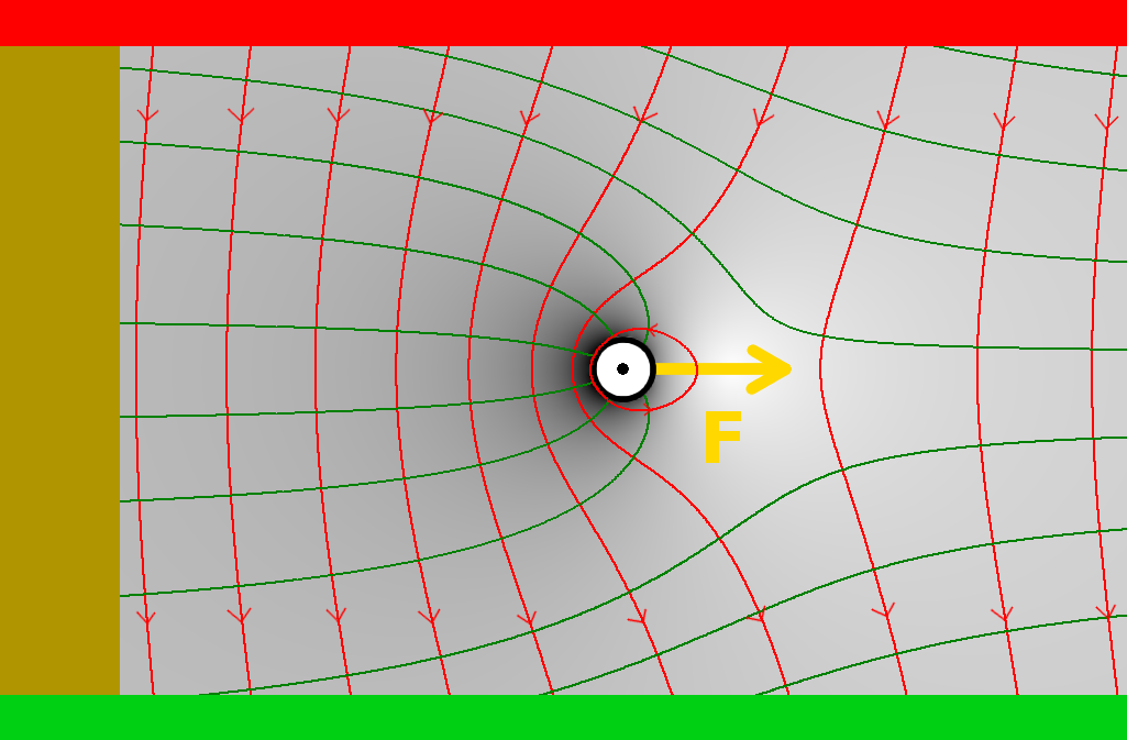 Datei:Magnetfeld Lorentzkraft Gesamtfeld Linien und Flächen Kraftpfeil.png