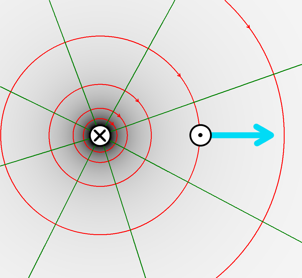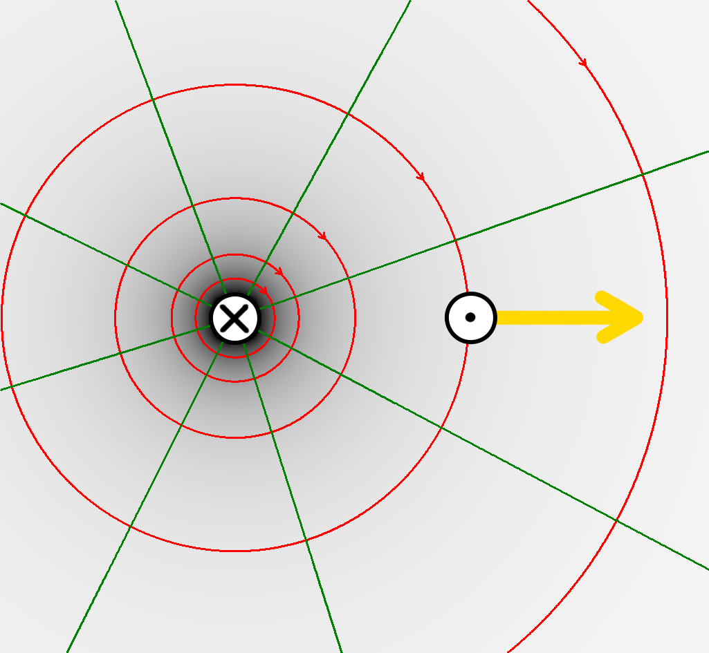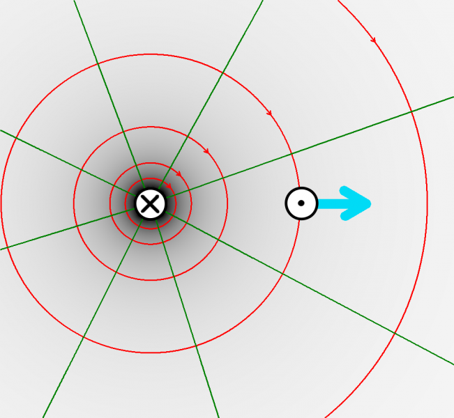 Datei:Magnetfeld zwei Kabel antiparallel Probestrom.png