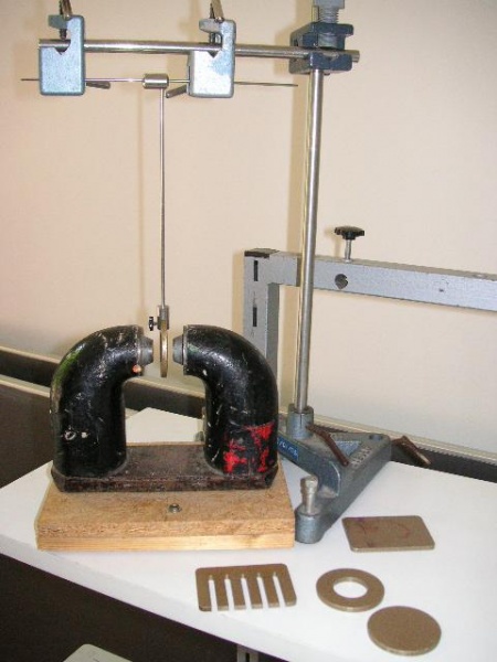 Datei:Versuchsaufbau Lenzsche Regel Wirbelstrom Pendel.jpg