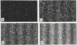 [1] Aufnahmen einer CCD-Kamera von Photonen hinter einem Doppelspalt. Von kurzer bis langer Messdauer.