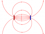 Die Enden der Magnetisierung sind Quellen und Senken der magnetischen Feldstärke. "Es gehen genausoviele Magnetisierungslinien hinein wie magnetische Feldstärkelinien heraus."