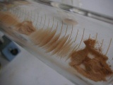 a) Vor ein an beiden Seiten offenes Glasrohr wird ein Lautsprecher gestellt, der mit einem Frequenzgenerator verbunden ist. In dem Rohr befindet sich feines Korkmehl, das man gut mit einer längeren Winkelleiste hineinbekommt. Ausgehend von einer eher niedrigen Frequenz (50 Hz) wird die Höhe des Tons immer weiter vergrößert.