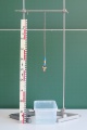 An einer Feder hängt eine mit einem Gewicht beschwerte Spielzeug-Figur. Darunter eine wassergefüllte Kiste. Die Person steht zu Beginn oben am Anfang der Feder und läßt sich dann fallen.