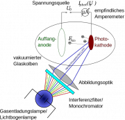 Das Licht einer Quecksilberdampflampe strahlt durch einen Interferenzfilter auf eine Photokathode. Dadurch wird ein schmaler Wellenlängenbereich gefiltert der auf die Kathode trifft. Zwischen Auffanganode und Photokathode wird über eine Spannungsquelle eine Spannung angelegt.