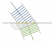 Die Wellentheorie fand ihre Anfänge mit der im Jahr 1650 gemachten Entdeckung von Christiaan Huygens, dass eine wellenförmige Ausbreitung des Lichts Phänomene wie Brechung, Beugung und Interferenz plausibel erklären würden. Sein formuliertes „Huygenssches Prinzip“ besagt, dass an jedem Punkt einer beugenden Fläche Kugelwellen ( Elementarwellen ) ausgehen. Tritt die Wellenfont in ein anderes Medium ein, so ändert sich die Ausbreitungsgeschwindigkeit und damit die Ausbreitungsrichtung. Die Welle wird gebrochen.