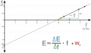 Schaltet man die Lampe nun an werden Elektronen aus der Kathode ausgeschlagen, welche sich aufgrund ihrer kinetischen Energie zur Anode bewegen und in diese eintreten. Jetzt legt man eine Gegenspannung [math]U_0[/math] an, damit die Elektronen nicht nur die Austrittsarbeit [math]W[/math] aus der Kathode verrichten müssen, sondern zusätzlich das erzeugte elektrische Feld überwinden müssen. Die Gegenspannung wird so lange erhöht bis keine Elektronen mehr an der Anode ankommen. Mit der ermittelten Spannung kann nun die maximale kinetische Energie der Elektronen nach dem Austritt aus der Kathode berechnet werden: [math]Epot = e \cdot U_0[/math] Dies kann man nun für verschiedene Frequenzen durchführen, als Ergebnis erhält man folgendes Diagramm, und damit die Bestätigung dass die übertragene Energiemenge eines Lichtteilchens nur von der Frequenz abhängig ist, und nicht von der Intensität („Amplitude“). Das heißt nicht jeder Frequenzbereich des Lichts kann den Fotoeffekt hervorrufen.