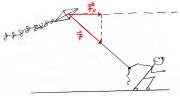 Hier übt das Männchen eine Kraft (F) auf den Drachen aus. Da diese jedoch schräg zur Bewegungsrichtung des Drachens gerichtet ist, wirkt von dieser Kraft effektiv nur die parallel gerichtetete Kraft [math]F_{||}[/math] auf den Drachen. Es wird also nur Energie in der Höhe von [math]E=F_{||}\, s[/math] übertragen.