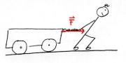 Das Männchen übt eine Kraft F in Richtung des Weges s auf den Wagen aus. Dabei wird die Energie [math]E=F\, s[/math] vom Männchen auf den Wagen übertragen. Das kann man daran sehen, dass der Wagen schneller wird. Der Wagen erhält kinetische Energie (Bewegungsenergie).