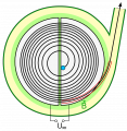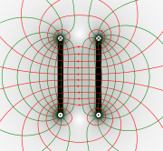 Das Spulenpaar, "Helmholtzspule" genannt, liefert ein relativ homogenes Feld zwischen den Spulen. Der Abstand R zwischen den Spulen ist genausogroß wie der Radius der Spulen.