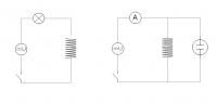 - Eine Spule (630Hy/280Ohm), eine Lampe (12V/0,1A) und ein Schalter sind in Reihe an eine Spannung von 30 Volt angeschlossen. Man schaltet ein und aus.