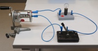 - Man dreht den Dynamo, um die Lampe zum Leuchten zu bringen und jemand schaltet die Lampe an und aus. (Schließt und öffnet den Stromkreis.)