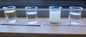 - Bechergläser, Spatel/Löffel, Wasser, Öl, Zucker, Mehl, Salz