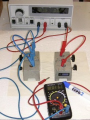 - Mit zwei Kroko-Kabeln werden die Pole an das Netzgerät angeschlossen. Den Minuspol legt man als 0V fest ("Erde")