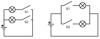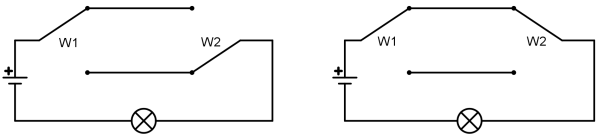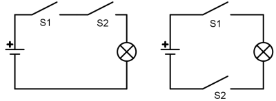 - Man muss mit dem Lämpchen und den beiden Schaltern einen Stromkreis aufbauen. Die Schalter sind in Reihe geschaltet: