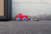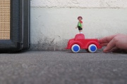Das Spielzeugauto rollt viel weiter als der Holzklotz rutscht.