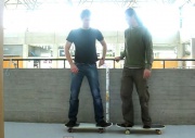 Karl und Karla stehen beide auf ihrem Skateboard. Karl stößt sich von Karla ab, wodurch Karl nach links rollt und Karla nach rechts.