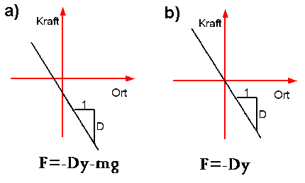 - [math]y(t)= \hat y \, \sin( \omega \, t) - \frac{m\, g}{D}[/math] mit [math]\omega ^2 = \frac{D}{m}[/math]