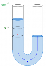 Den Ort der Flüssigkeit kann man durch die Lage eines Wasserspiegels beschreiben. Dabei sind Auslenkungen nach oben positiv und der Koordinatenursprung ist in der Ruhelage.
