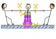 a) Anton sitzt auf einem Bürostuhl mit Rollen und streckt die Arme nach rechts und links. In den Händen hält er je ein Seil. Berta und Carla ziehen an den Seilen nach rechts, bzw. nach links.