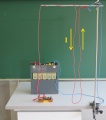 Wenn man einen Bleiakku ("Autobatterie") mit einem Kabel "kurzschließt", fließt ein Strom mit sehr großer Stromstärke. (Deswegen sollte man mit dem Taster den Stromkreis auch nicht zu lange schließen.) Das dazu verwendete Kabel legt man auf verschiedene Arten über eine Stange.