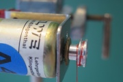 Ein Doppelschichtkondensator (5,5V/1F) wird geladen, indem er ca. eine halbe Minute mit einer 4,5V-Flachbatterie verbunden wird. (Dabei muss man auf die Polung achten.) Damit kann man einen Elektromotor betreiben, der ein kleines Gewicht von 10g Masse hochhebt.